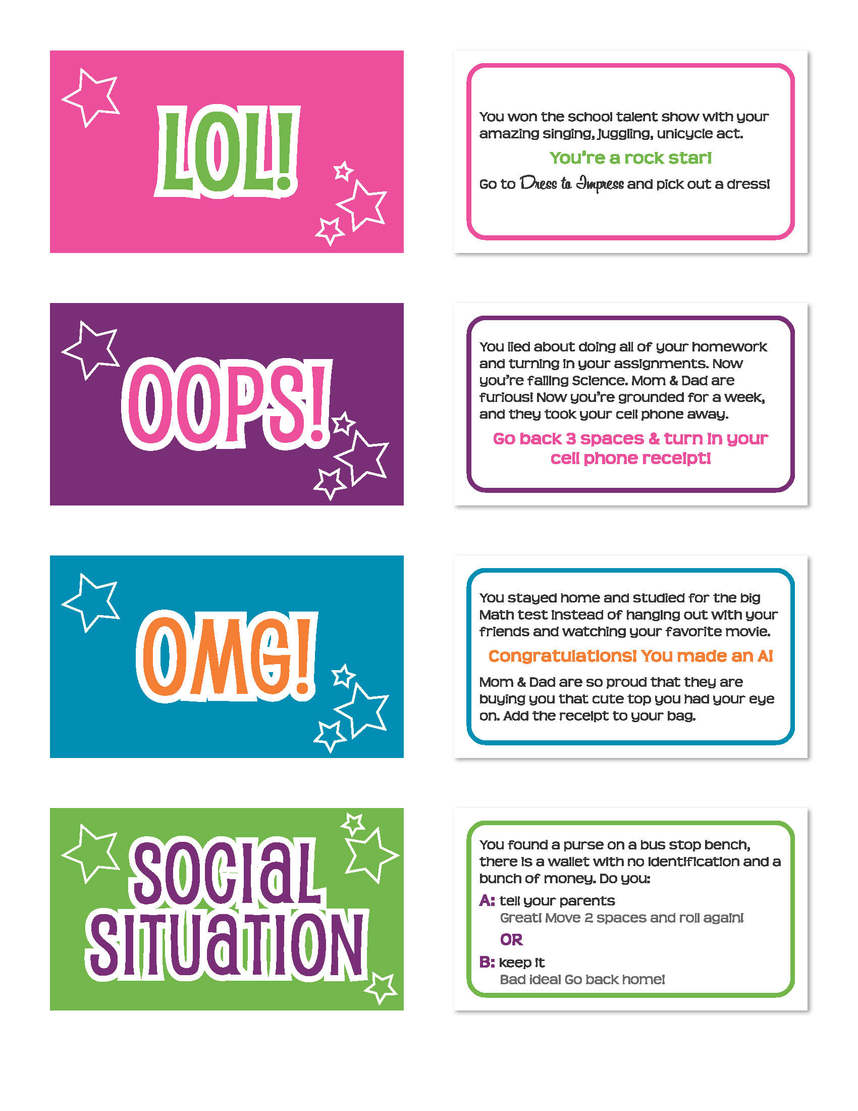 Playing cards that are drawn when a player lands on a designated space. Question on the Social Situation cards are read aloud by another player.